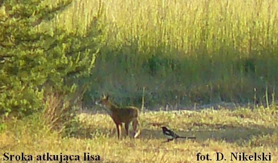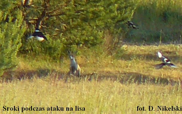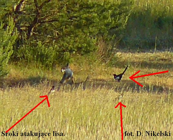 Na dowód tego, że sroki są ptakami bardzo inwazyjnymi, agresywnymi i nie tolerującymi konkurencji w łańcuchu pokarmowym dołączam zdjęcia srok atakujących lisa. Lisy stanowią dla srok konkurencję, bowiem oba gatunki żywią się również padliną i odpadkami. Wielokrotnie zaobserwowałem taki oto obrazek: przechadzający się lis, a za nim lub w koło niego kilka srok próbujących go uszczypnąć i skrzeczących mu nad głową by go przepędzić. Lisy nic sobie nie robią z takiego jazgotu. Zachowują się tak jakby srok nie było (np drapią się, czyszczą sierść itp). Do tego stopnia ignorują sroki, że te podchodzą na odległość z której teoretycznie mogą zostać złapane przez lisa. Być może o to właśnie mu chodzi, w końcu lisy to też niezłe zwierzęce spryciule